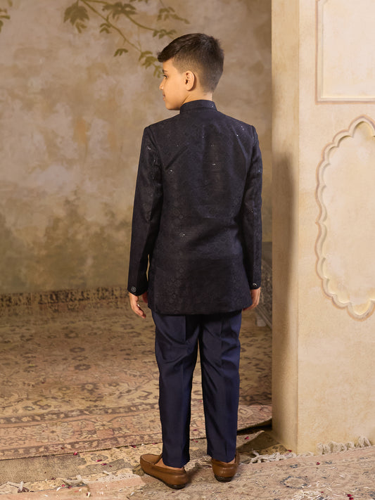 Boys Blue Jacquard Full Sleeves Sequins and Embroidery Sherwani