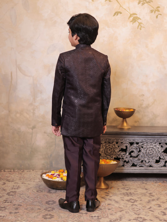Boys Maroon Jacquard Full Sleeves Sequins and Embroidery Sherwani