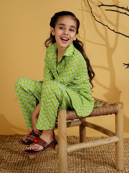 AJ Dezines Green Cotton 3/4th Sleeves Zig-zag Printed Girls Co-Ords