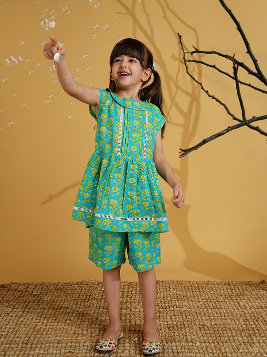 AJ Dezines Green Cotton Half Sleeves Floral Printed Girls Co-Ords