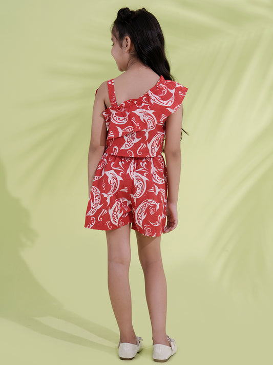 AJ Dezines Red Cotton Sleeveless Dolphin Printed Girls Co-Ords