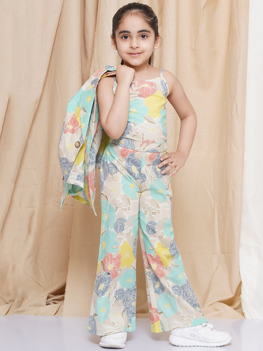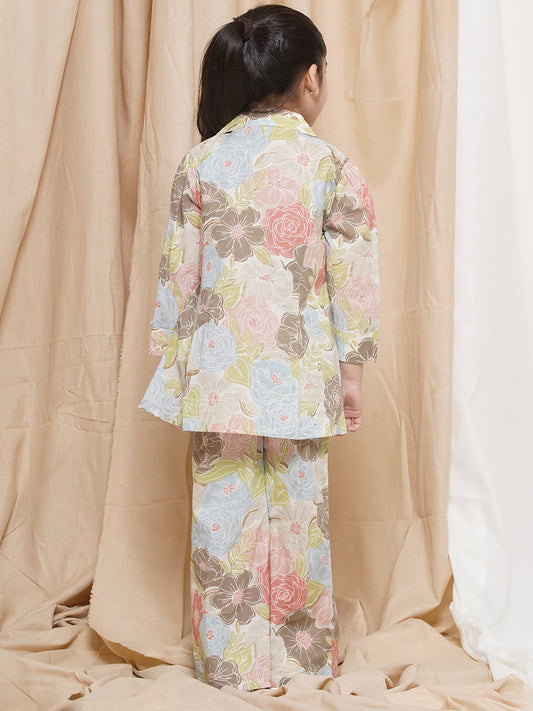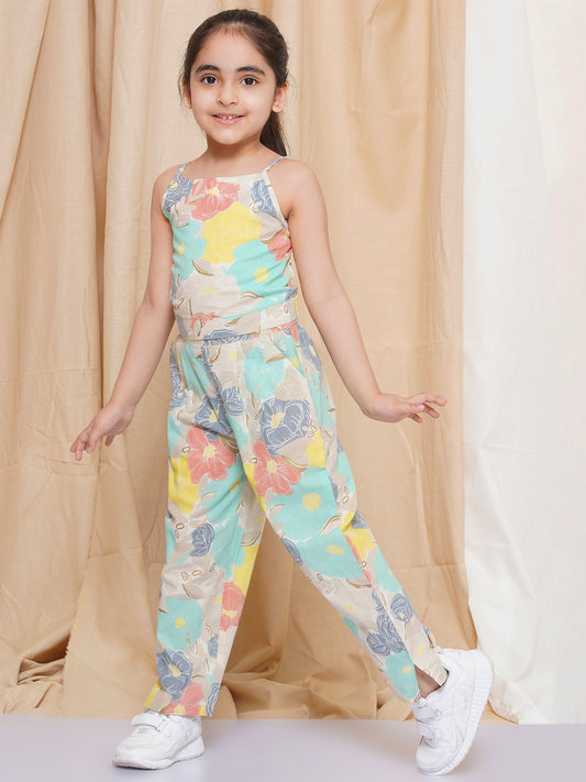 Multi color Pure Cotton Sleeveless Floral Print Co-Ords Set for Girls