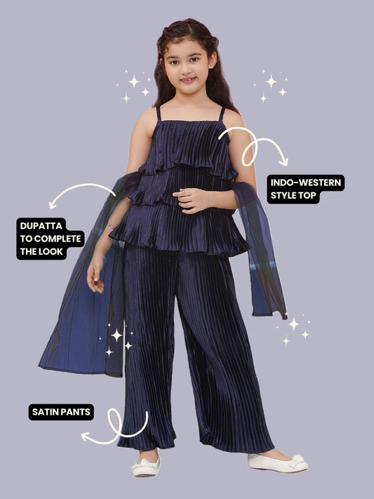 Satin Dark Blue Sleeveless Indo Western with dupatta for Girls