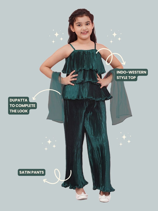 Satin Dark Green Sleeveless Indo Western with dupatta for Girls