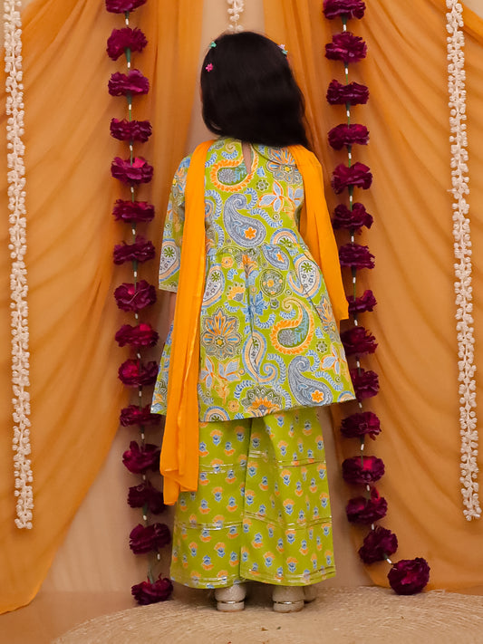 Girls Green Cotton Three-Fourth Sleeves Floral Printed Girls Suit Set