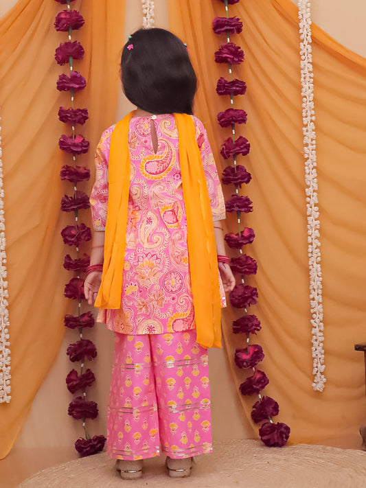 Girls Pink Cotton Three-Fourth Sleeves Floral Printed Girls Suit Set