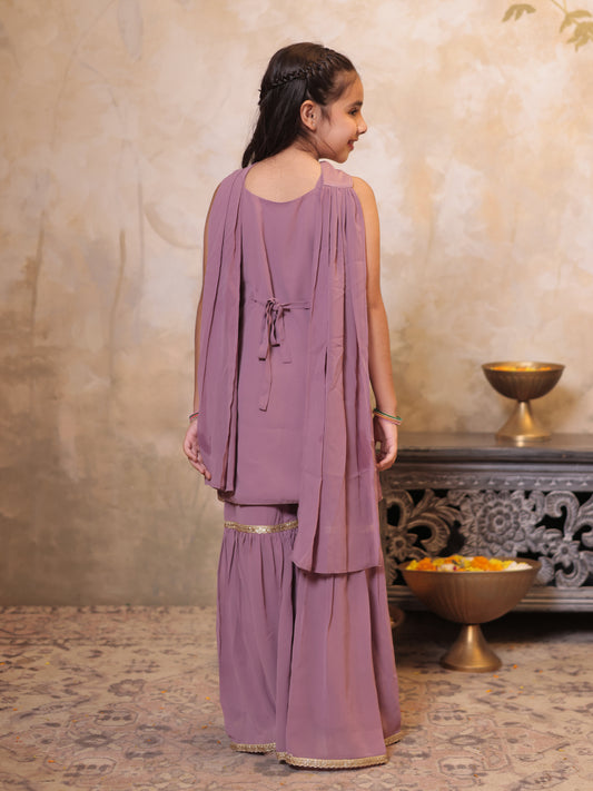 Girls Wine Georgette Sleeveless Heavy Embroidered Girls Sharara Set