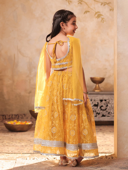 Girls Yellow Net Sleeveless Heavy Embroidered Lehenga Choli
