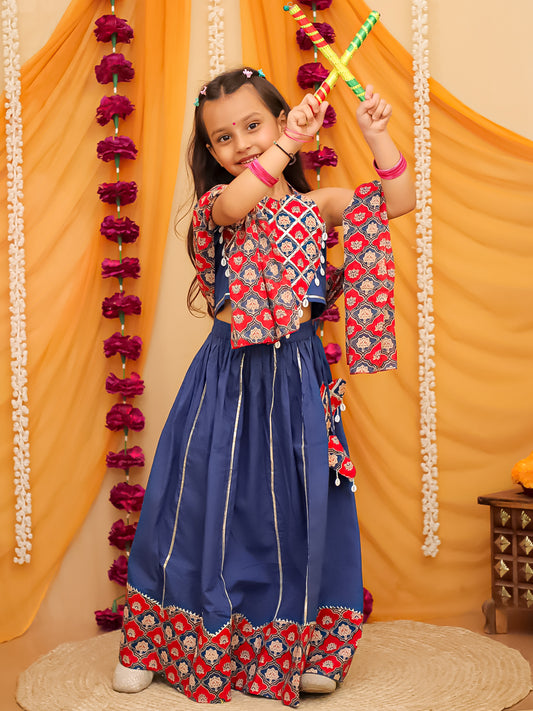 Blue Cotton Sleeveless Floral Printed And Gotta Work Lehenga Choli