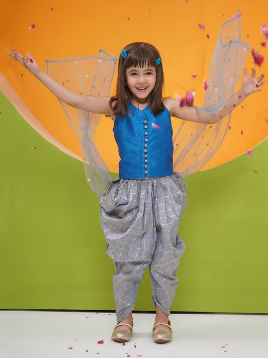 Aj Dezines Dark Blue-Grey Silk Blend Sleeveless Check Pattern Print Indo Western For Girls