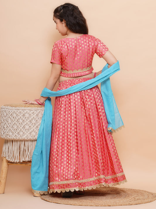 Aj Dezines Peach Poly Chanderi Half Sleeves Motif Print Lehenga Choli For Girls