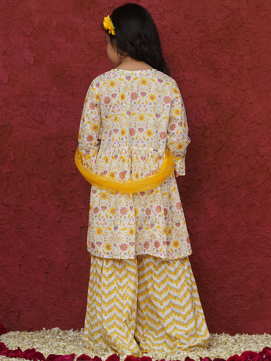 Aj Dezines Yellow Cotton Sleeveless Floral Print Girls Kurti and Sharara Set with Gotta Work