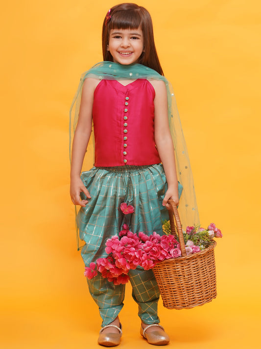 Aj Dezines Dark Pink-Blue Shinny Silk Blend Sleeveless Check Pattern Print Indo Western For Girls