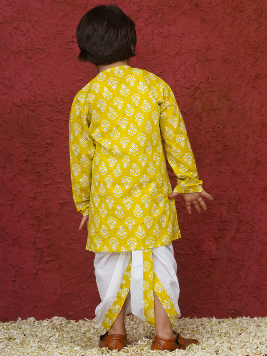 Aj Dezines Yellow Cotton Full sleeves Floral Print Dhoti Kurta for Boys