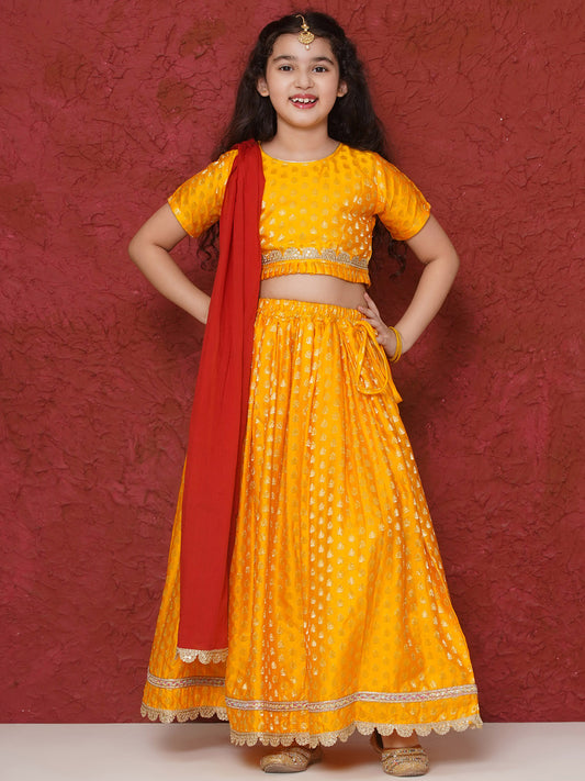 Aj Dezines Yellow Poly Chanderi Half Sleeves Motif Print Lehenga Choli For Girls
