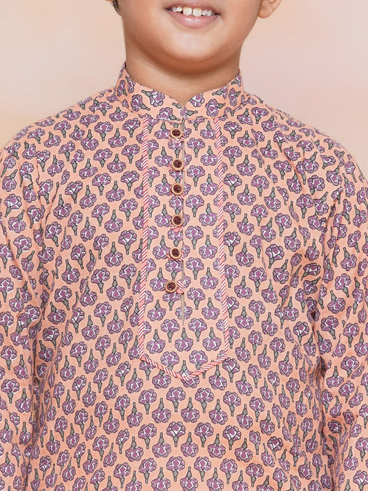 Kids Boys Beige Floral Print Cotton Kurta Pyjama Set