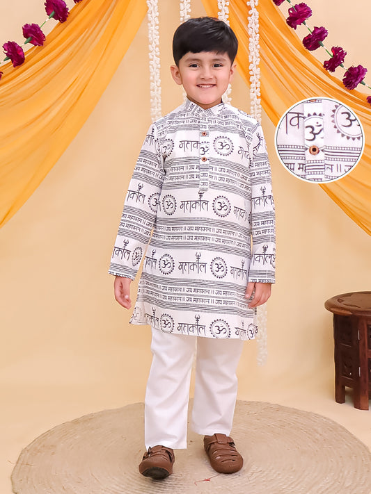 Boys White Cotton Full sleeves Om Mahakal Printed Kurta Pyjama Set