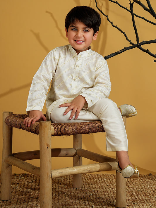 AJ Dezines White Silk Blend Full Sleeves Embroidered Kurta Pyjama Set