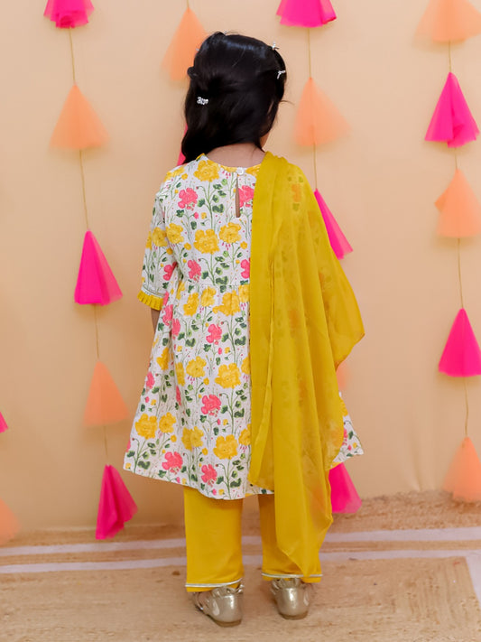 AJ Dezines Yellow 3/4th Sleeves Floral Print Cotton Girls Suit Set For Girls