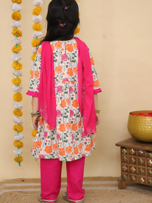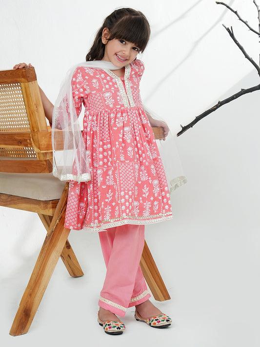 Aj Dezines Pink Cotton 3/4th Sleeves Floral Printed with Lace Girls Suit Set