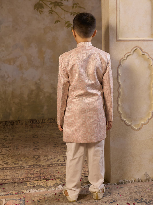 Boys Peach Jacquard Full Sleeves Sequins and Embroidery Sherwani