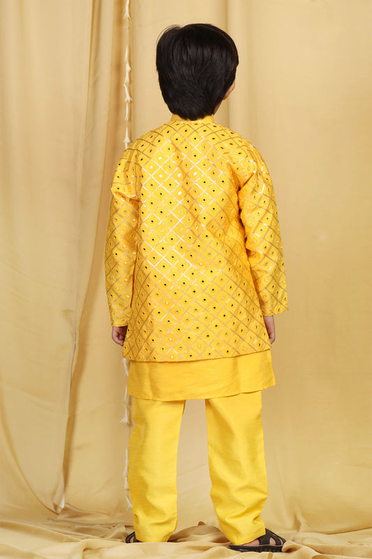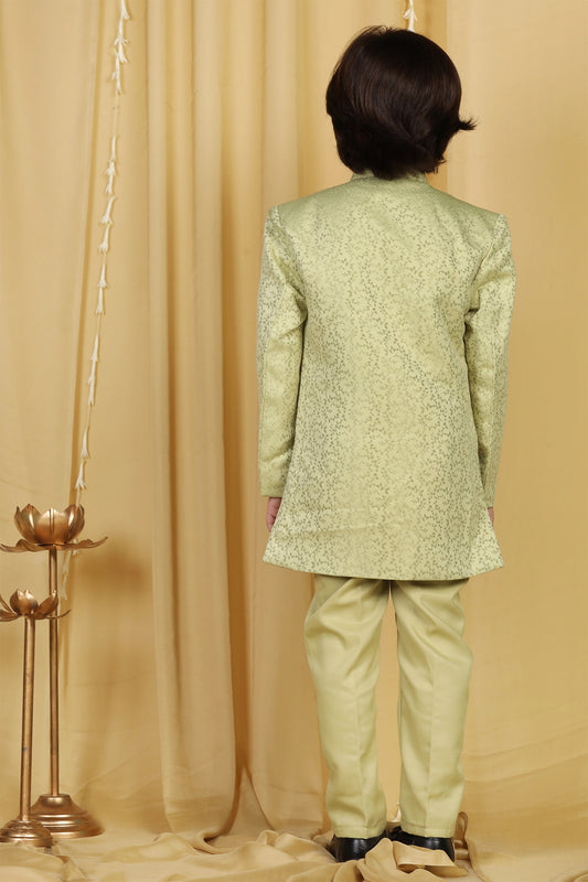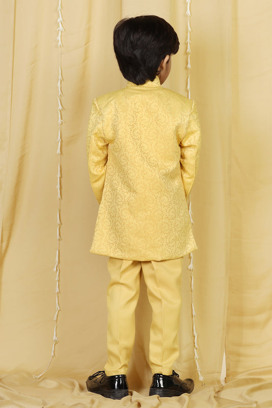 Kids Boys Yellow Printed Polyester Cotton Sherwani