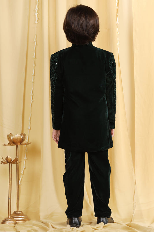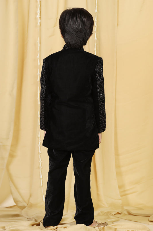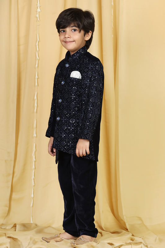 Kids Boys Navy Blue Embroidered Velvet Sherwani