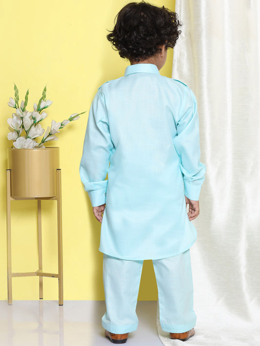 Kids Boys Sky Solid Cotton Blend Pathani Suit