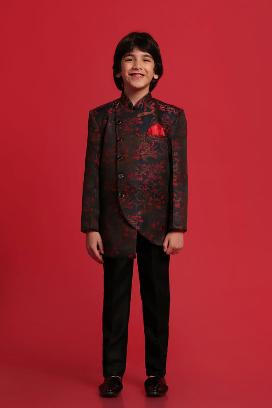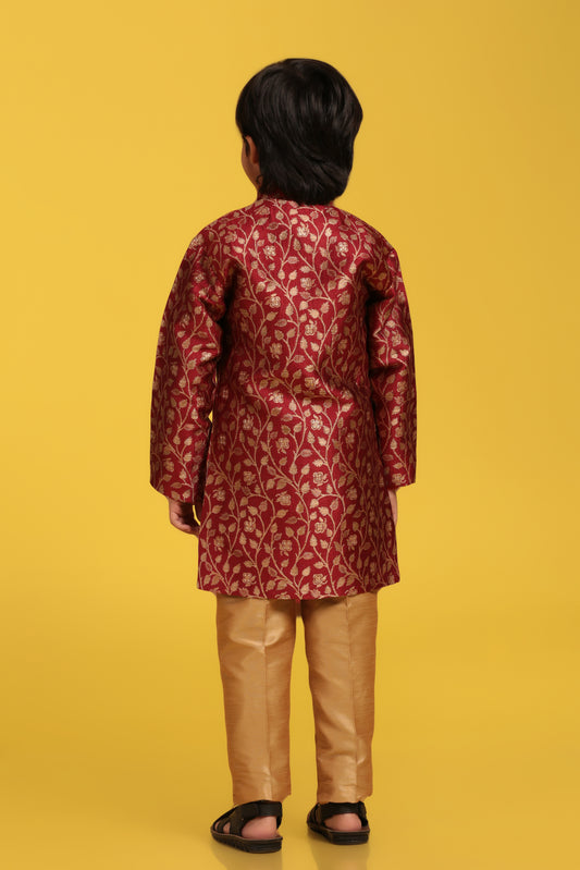 Kids Boys Maroon Self Design Cotton Silk Suit Set