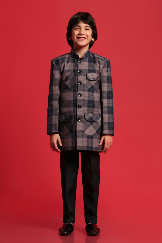 Kids Boys Beige Checkered Cotton Blend Indo Western