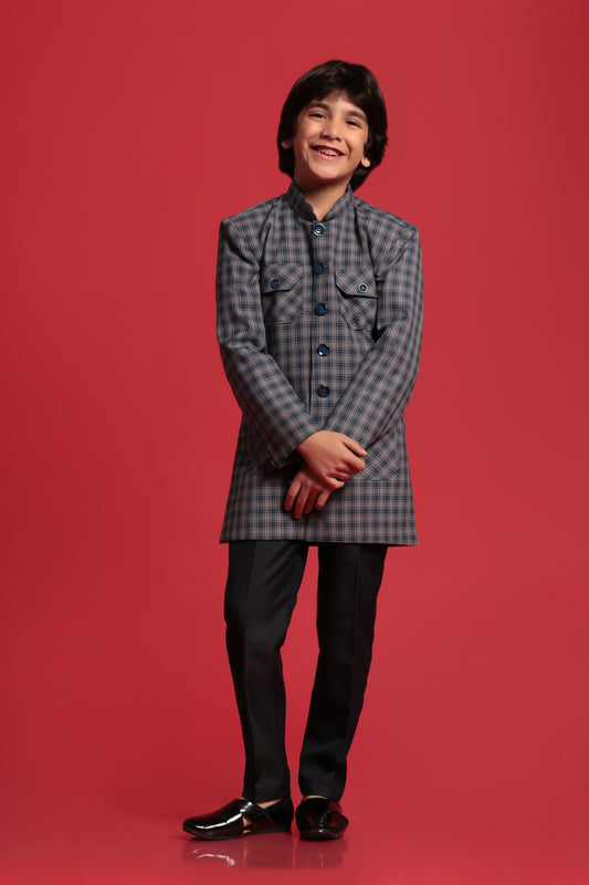 Kids Boys Navy Blue Checkered Cotton Blend Indo Western