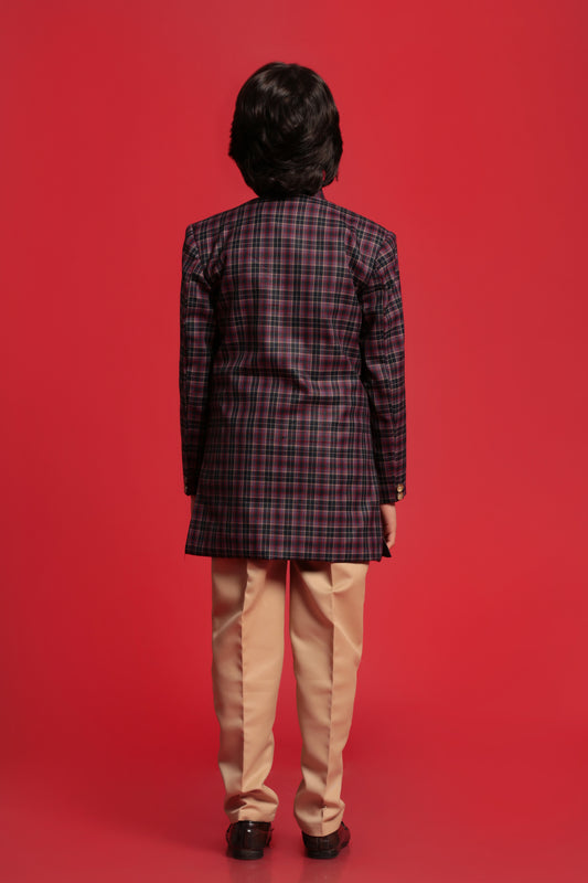 Kids Boys Purple Checkered Cotton Blend Indo Western