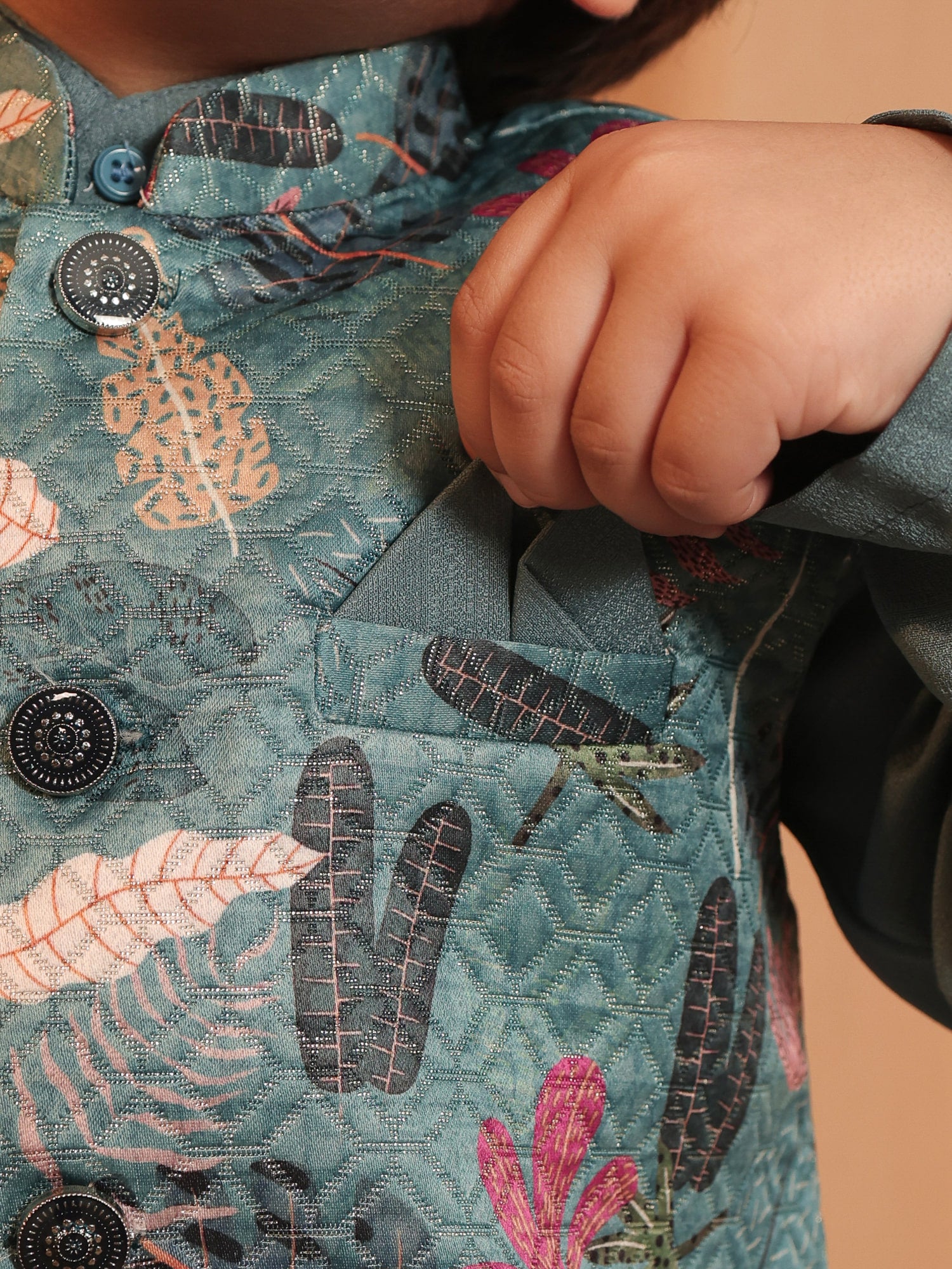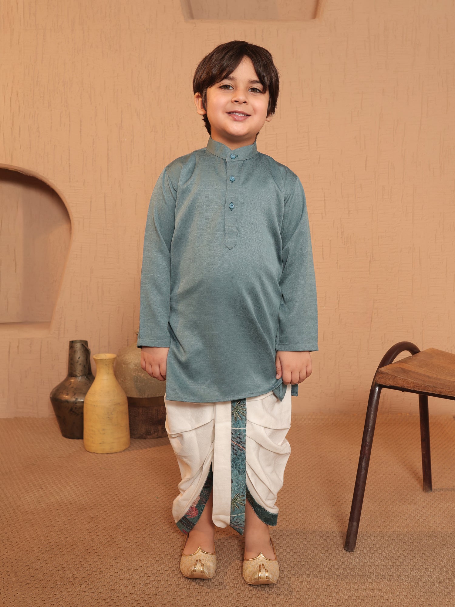 Stylish 3-piece Blue cotton dhoti set for boys by AJ Dezines. Includes solid kurta, floral printed waistcoat & dhoti. Soft, breathable, and perfect for festive or traditional occasions.