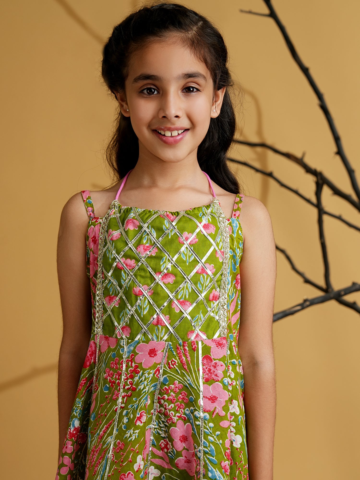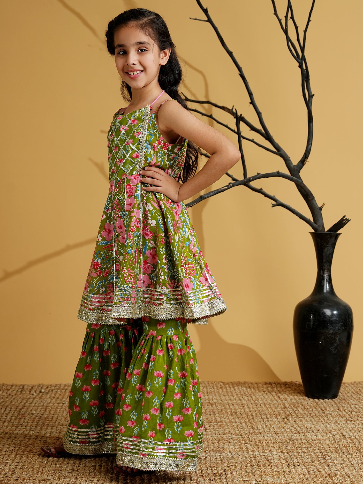 Aj Dezines Green Cotton Sleeveless Floral Print Girls Kurti and Sharara Set with Gotta Work