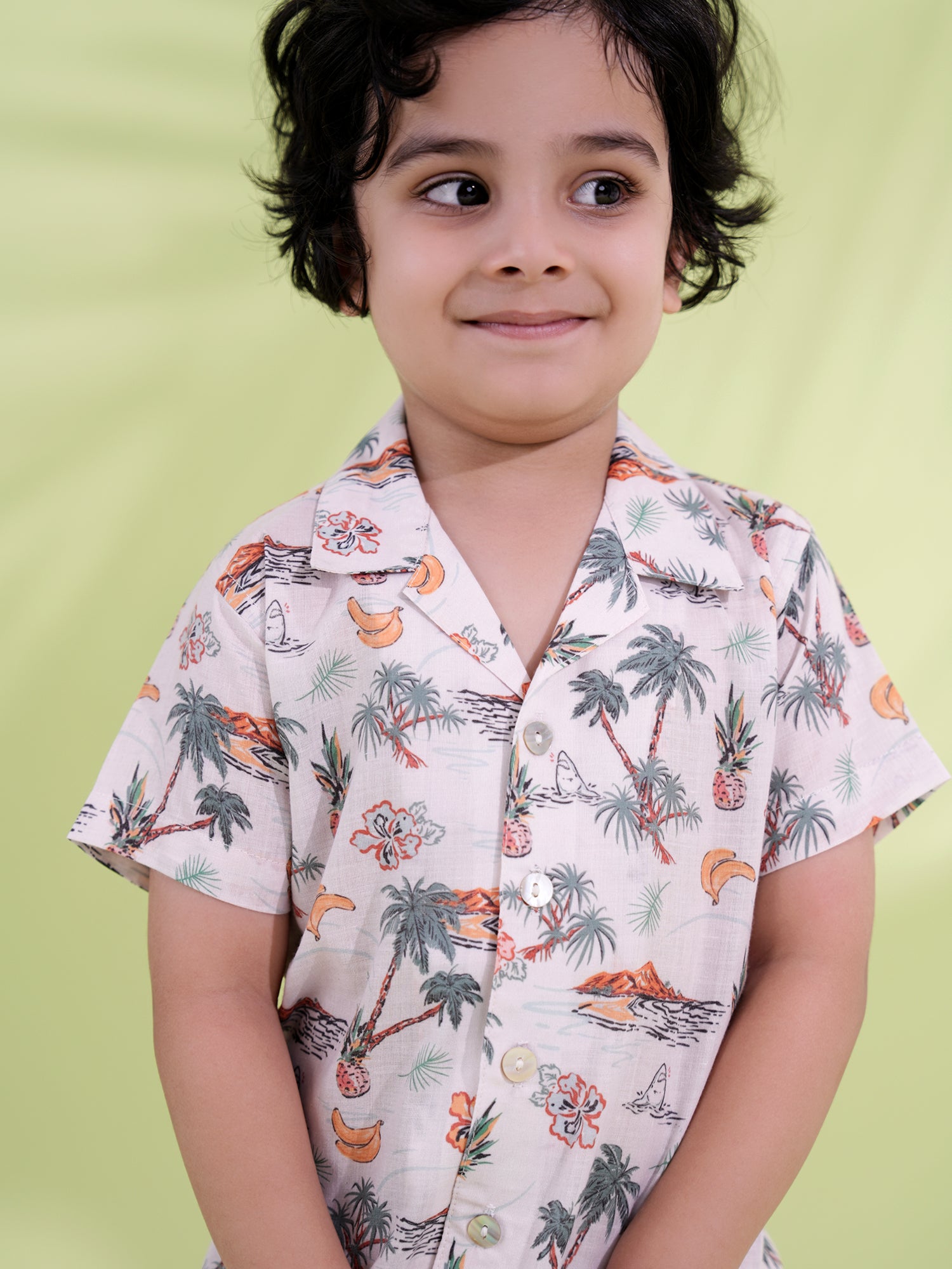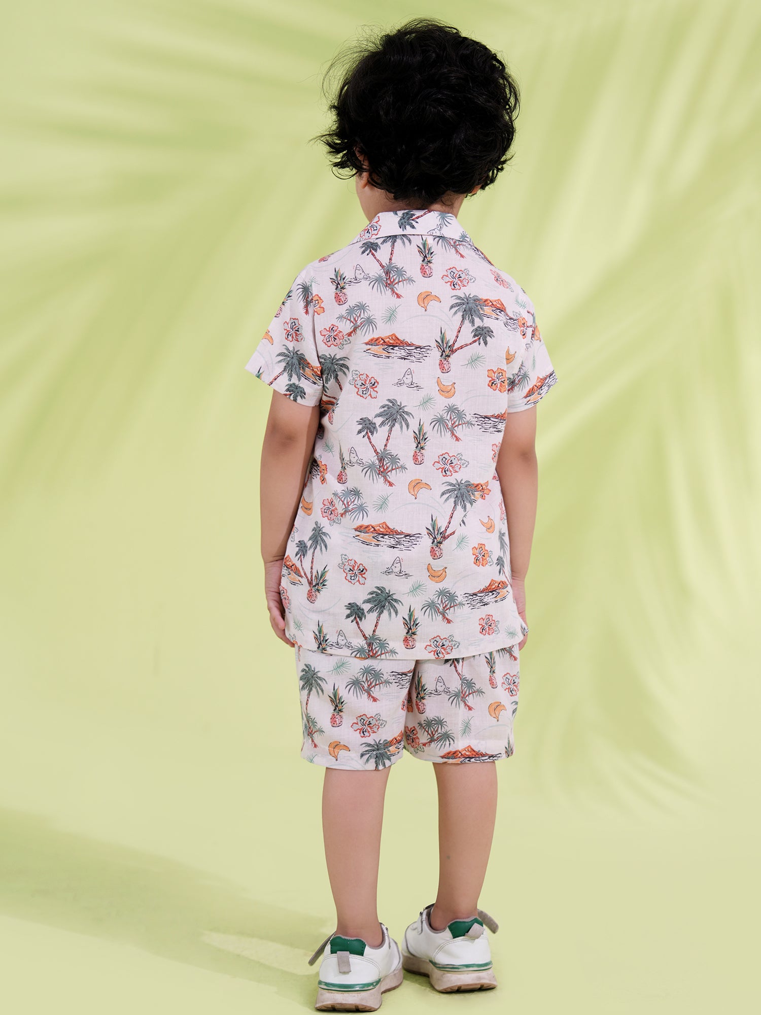 AJ Dezines White Cotton Half Sleeves Co-Ords for boys featuring tropical prints. Soft, breathable, and stylish—perfect for summer outings, vacations, or casual playtime fun.