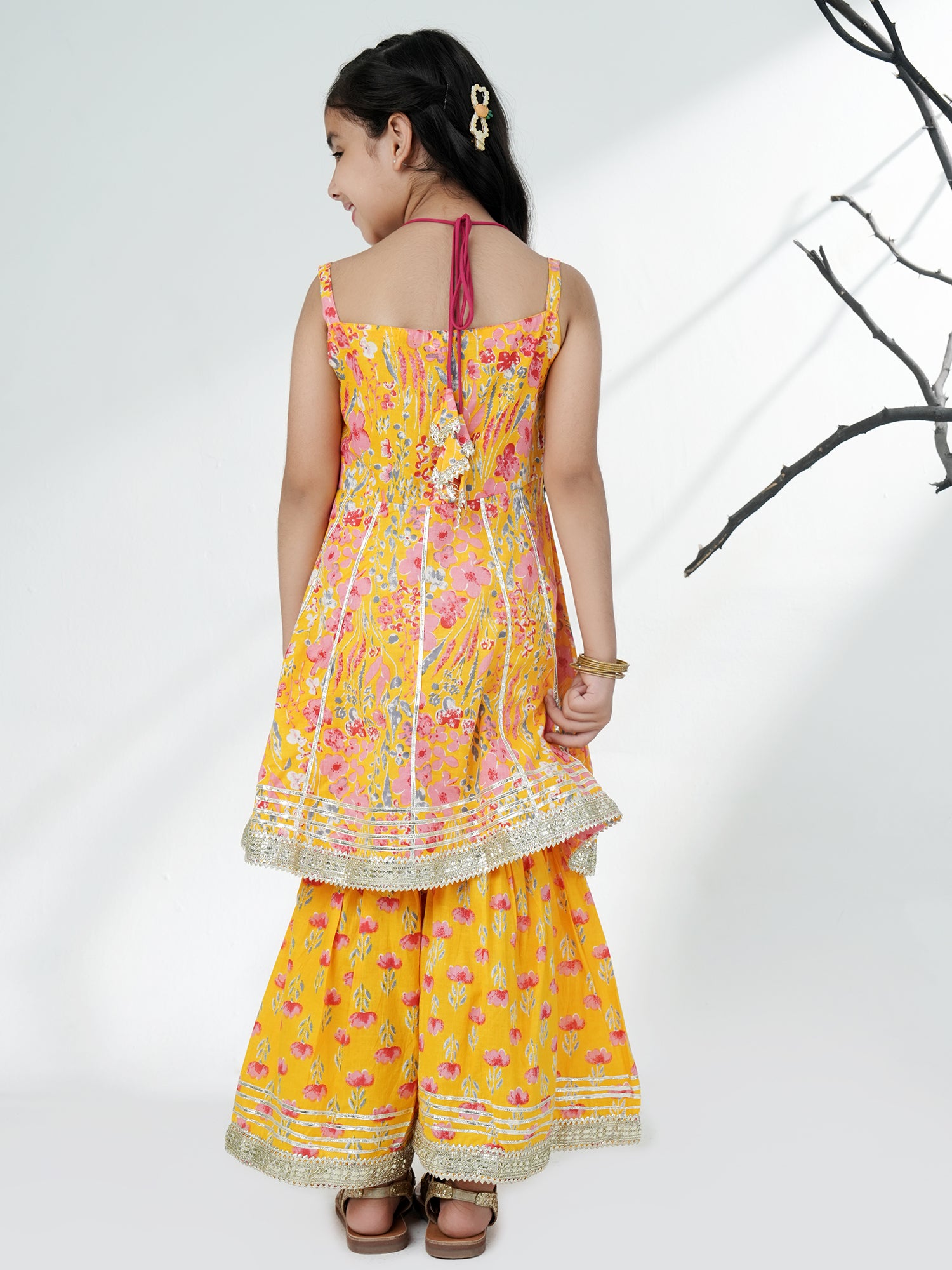 Aj Dezines Yellow Cotton Sleeveless Floral Print Girls Kurti and Sharara Set with Gotta Work
