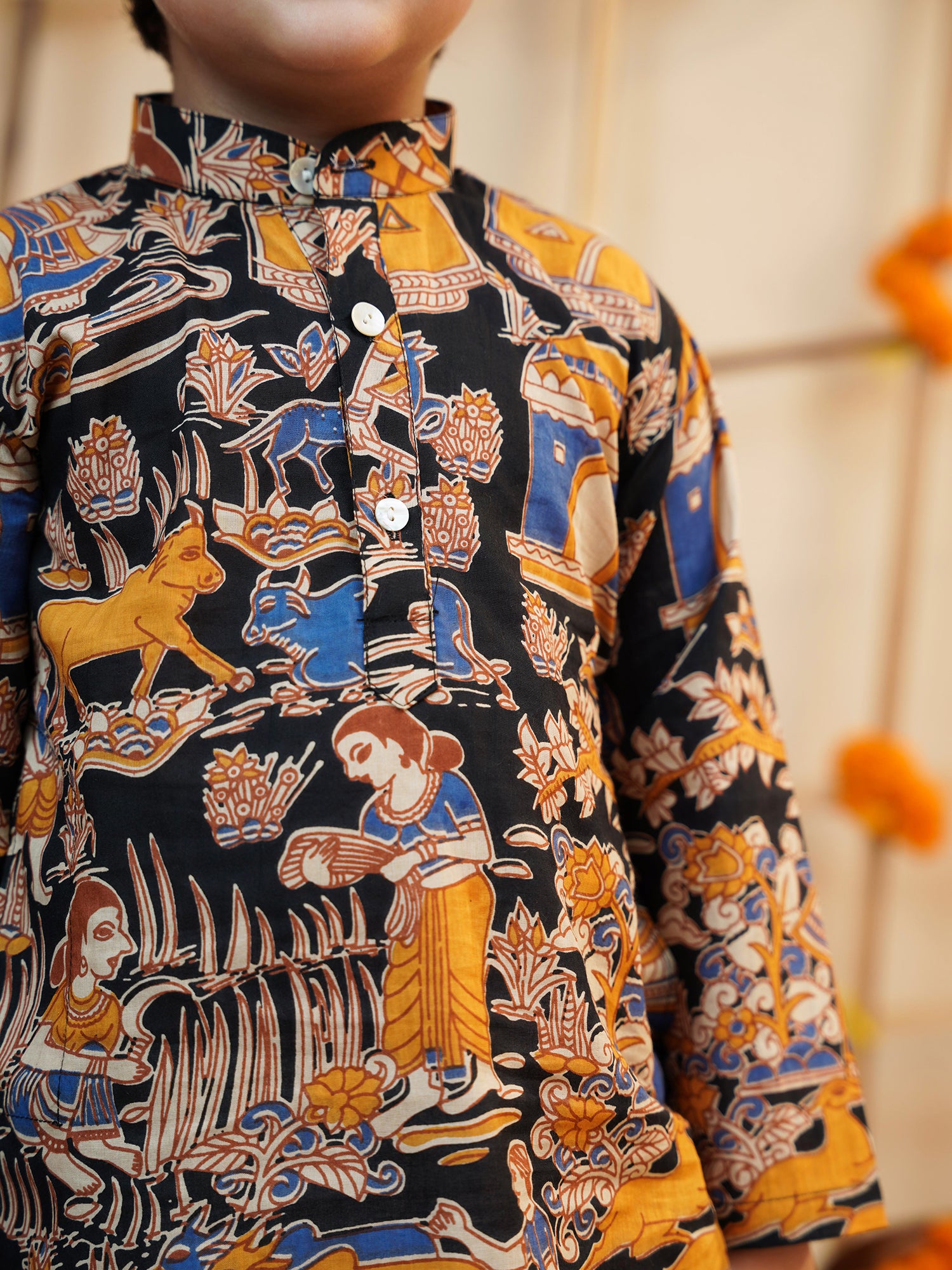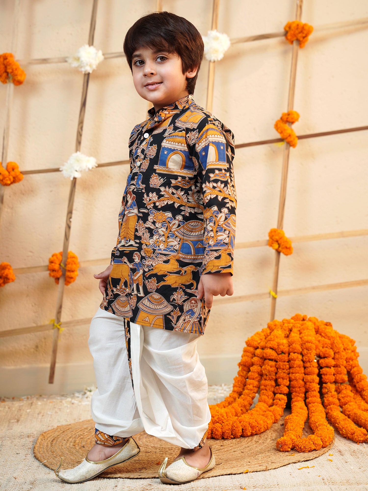 Boys Black Cotton Full Sleeves Abstract Printed Dhoti Set