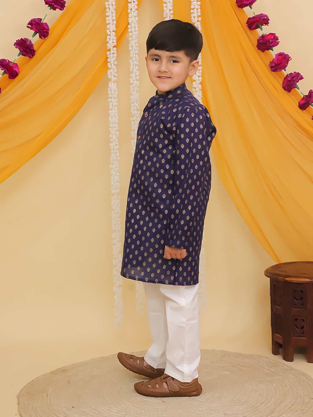 Boys Blue Cotton Full sleeves Foil Printed Kurta Pyjama Set