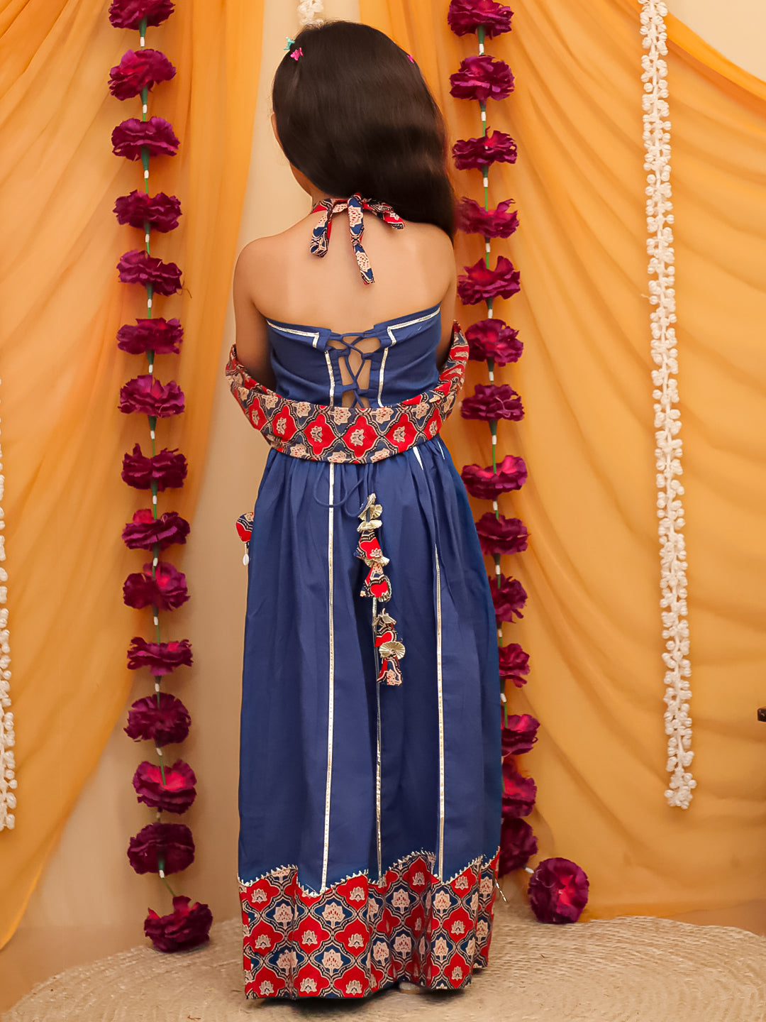 Bright and breezy Blue cotton lehenga choli with floral print. Sleeveless design, comfy fit, and matching dupatta – perfect for festive occasions and celebrations.
