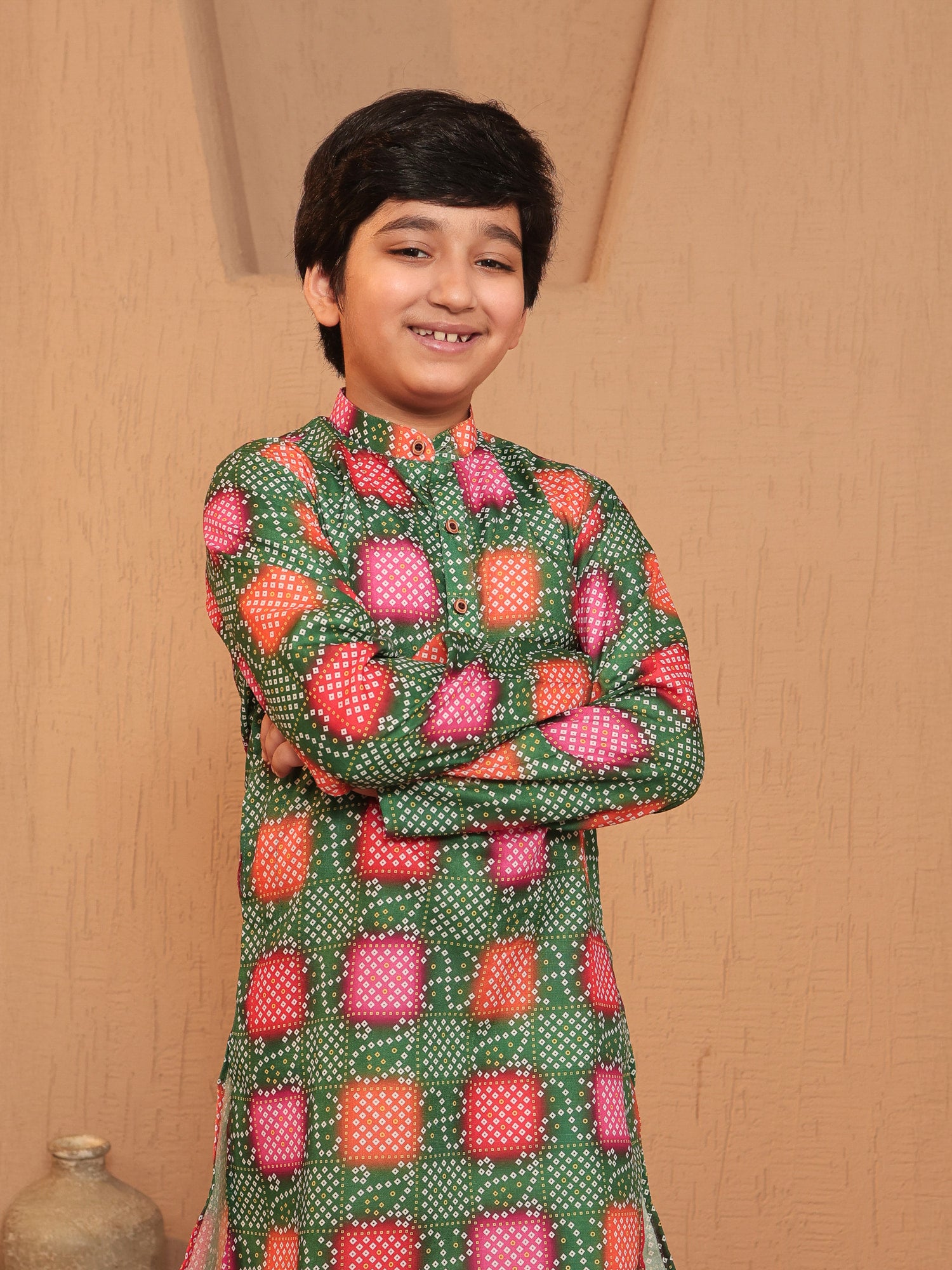 Boys Green Cotton Full sleeves Printed Kurta Pyjama Set