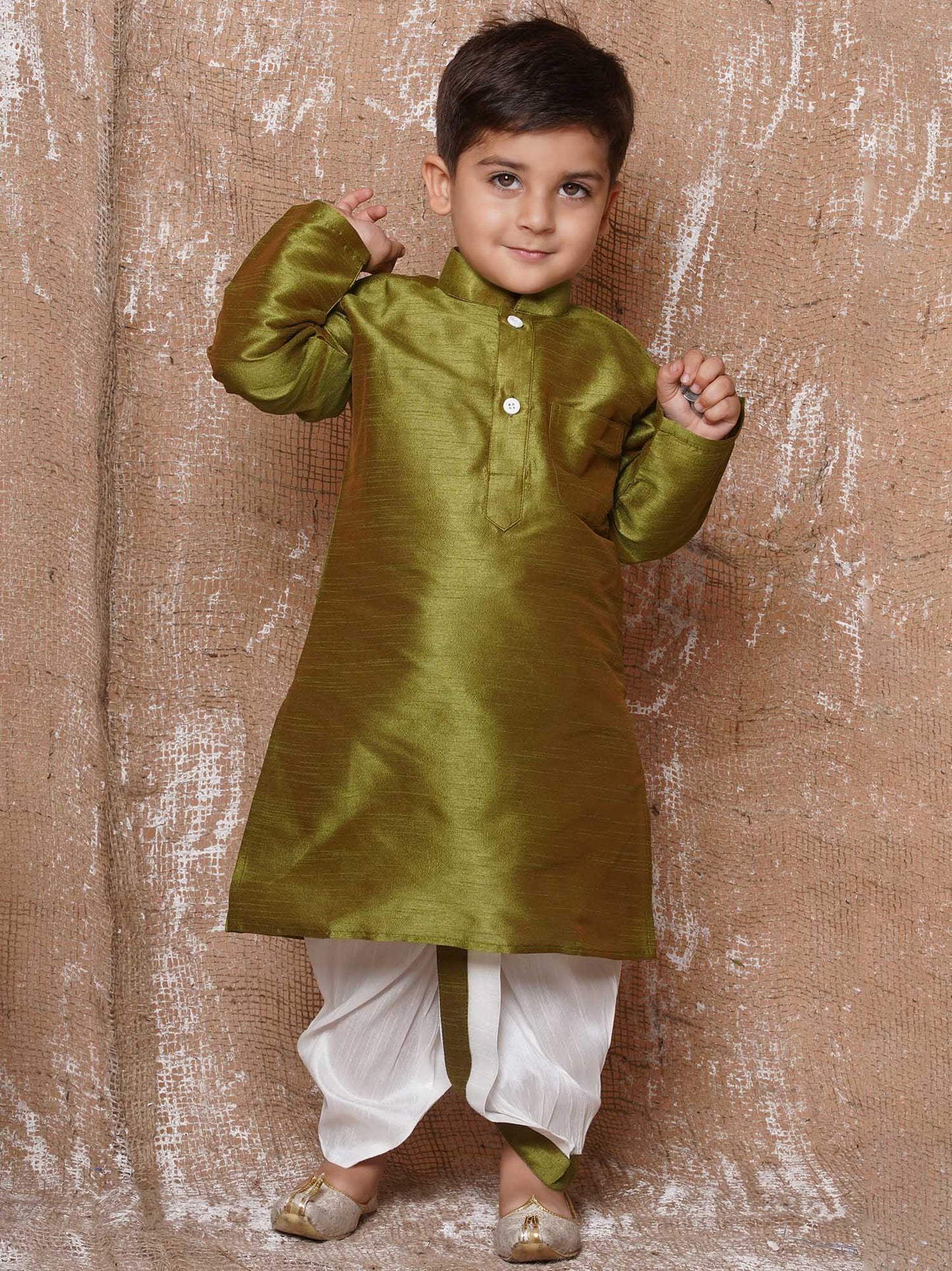 Kids Boys Olive Solid Silk Blend Dhoti Set