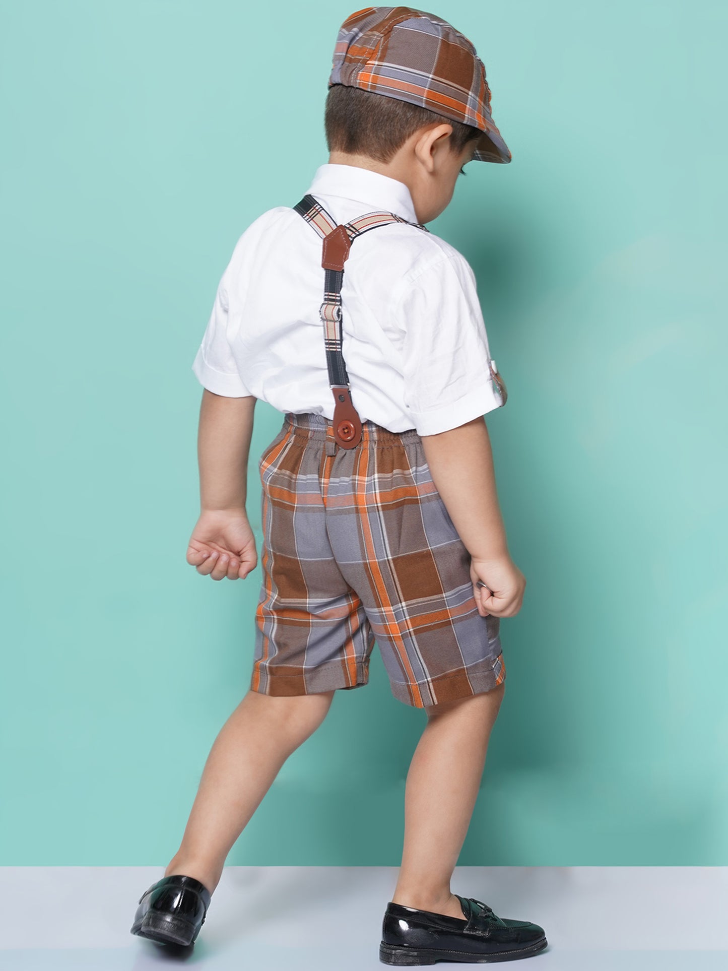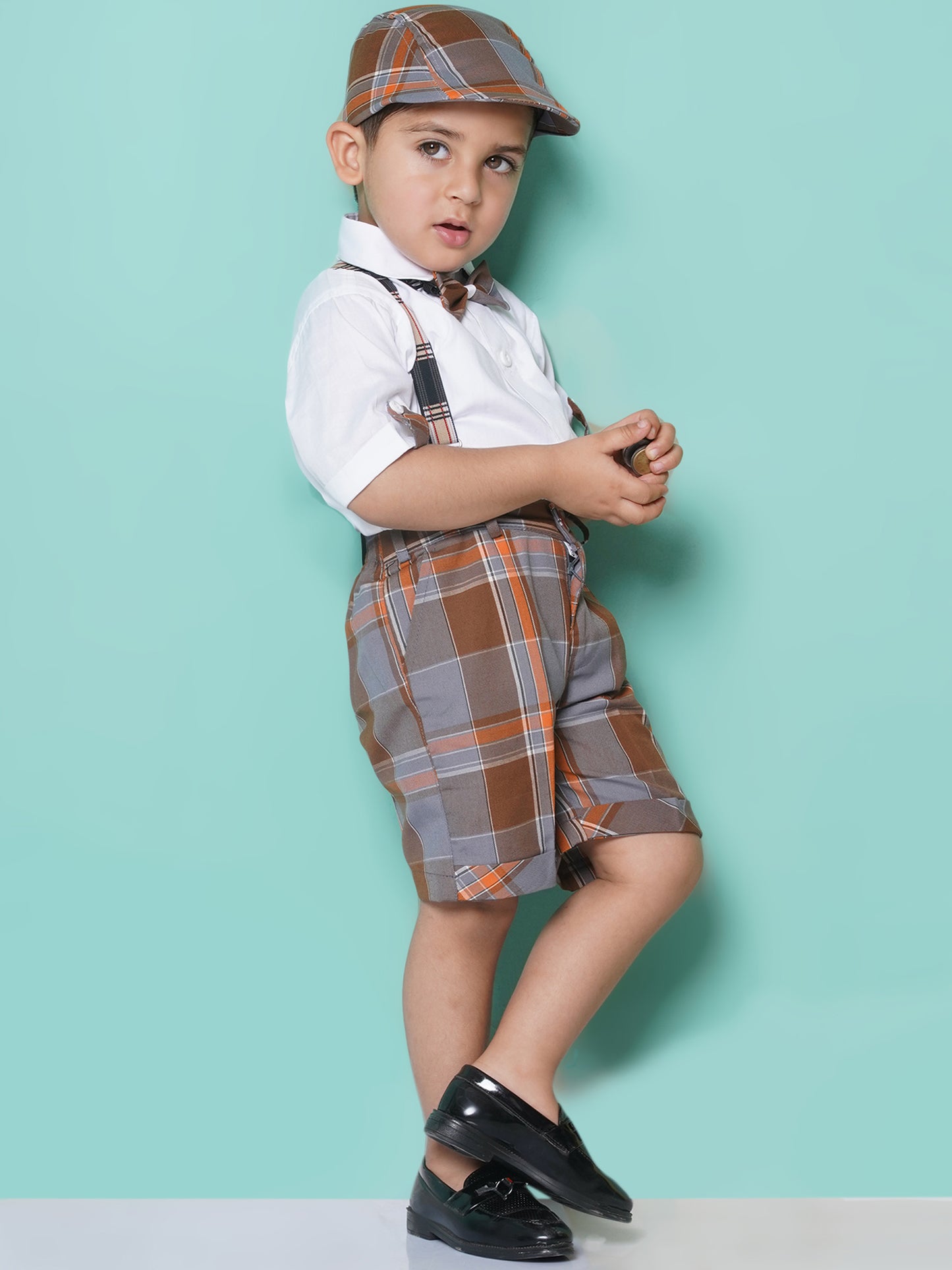 - Features - Solid Shirt has Front Button Closure, Half Sleeve, Spread Collar with Shorts Matching Bow, Shorts Has Check Pattern and Patial Elastic Waistband, Button & Zipper Closure, Have Two Pocket. Suspender Features - Matching Suspender, Strip Pattern, Elasticated. Cap matching with shorts.