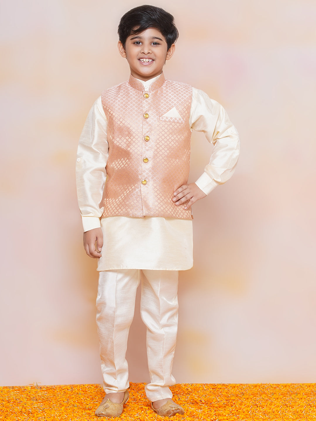 A stylish party wear ethnic suit set for your little master from AJ DEZINES. Made from cotton fabric, this ethnic suit set comes with a kurta, a waistcoat and pair of pajama makes this ethnic wear elegant and traditional. Kurta, has a mandarin collar, a full button placket, long sleeves, curved hem, side slits. Waistcoat, has a Nehru collar, a full button placket, sleeveless. This Kids dress ensures maximum comfort. Pyjama has elasticated waistband. You can team this set with a pair of shoes to complete your boy party and stylish look. This indo western suit set is ideal for the special parties, functions, birthday party, festival, wedding and occasion. We are a leading brand in Kids wear with wide range of Kids clothing which includes Kids ethnic wear, accessories and a lot more.