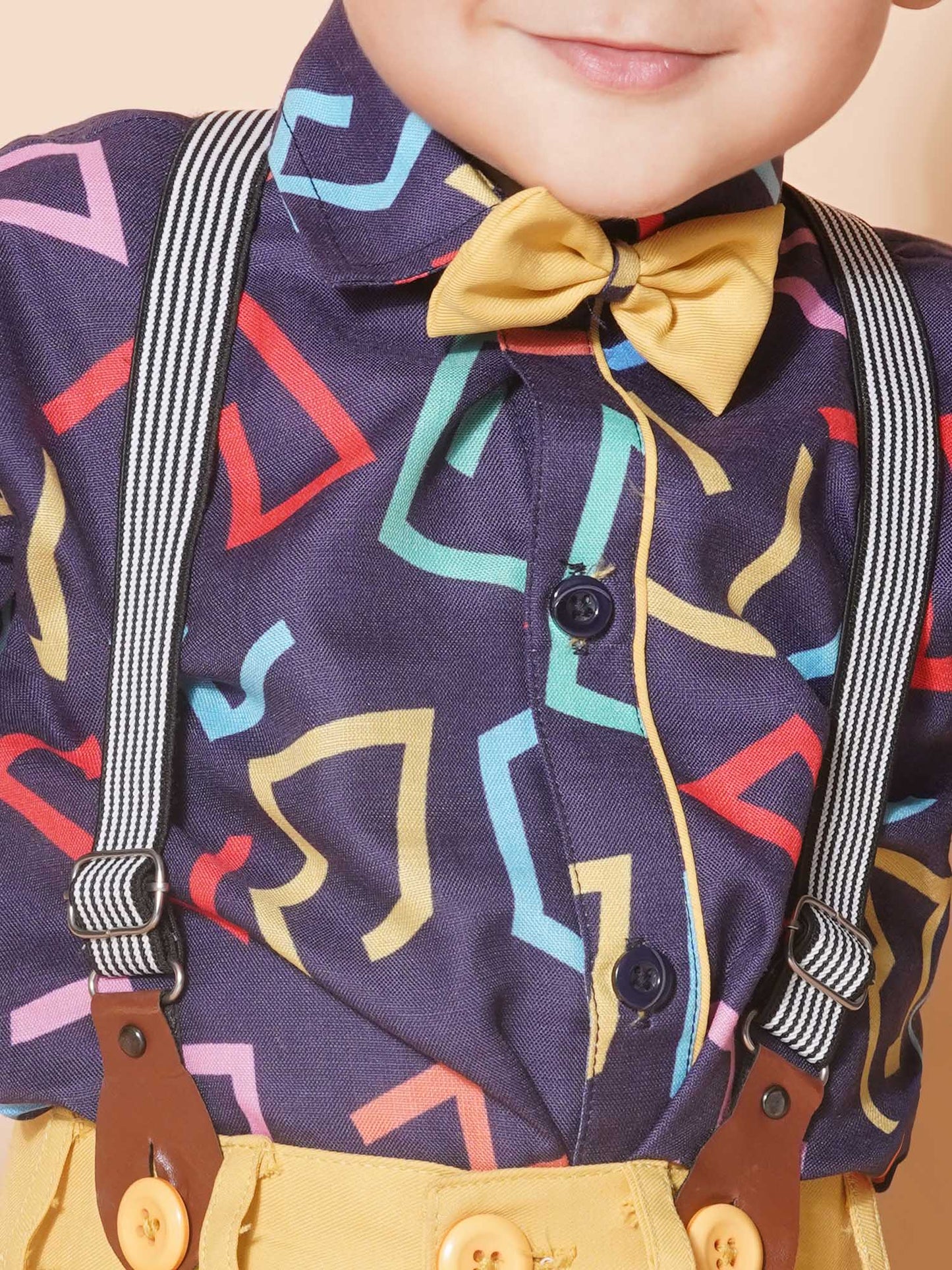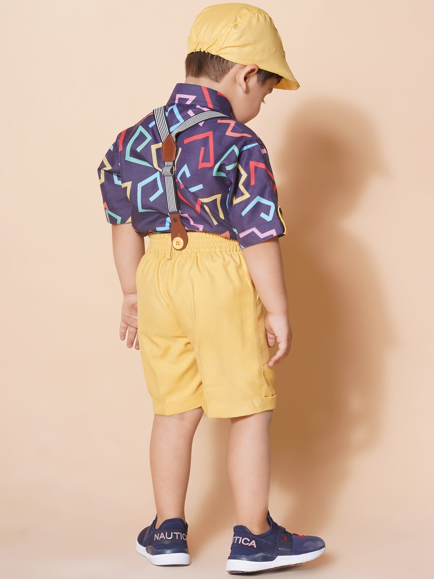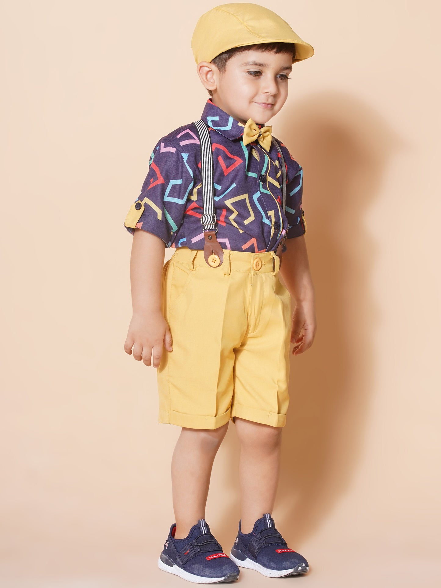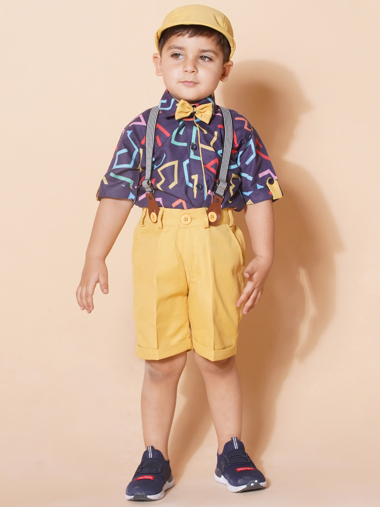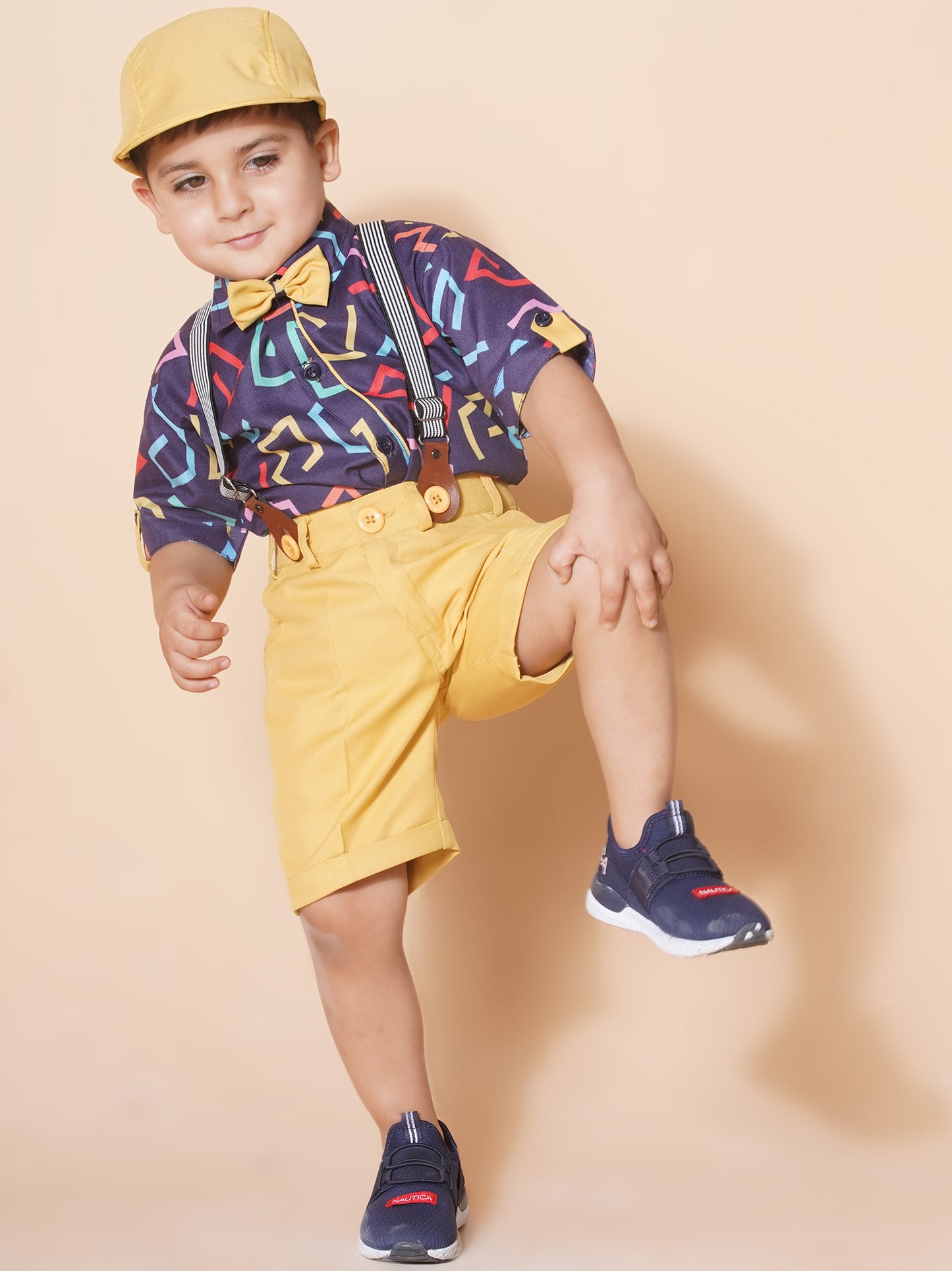 - Features - Printed Shirt has Front Button Closure, Half Sleeve, Spread Collar with Shorts Matching Bow, Shorts Has Solid Pattern and Patial Elastic Waistband, Button & Zipper Closure, Have Two Pocket. Suspender Features - Matching Suspender, Strip Pattern, Elasticated. Cap matching with shorts