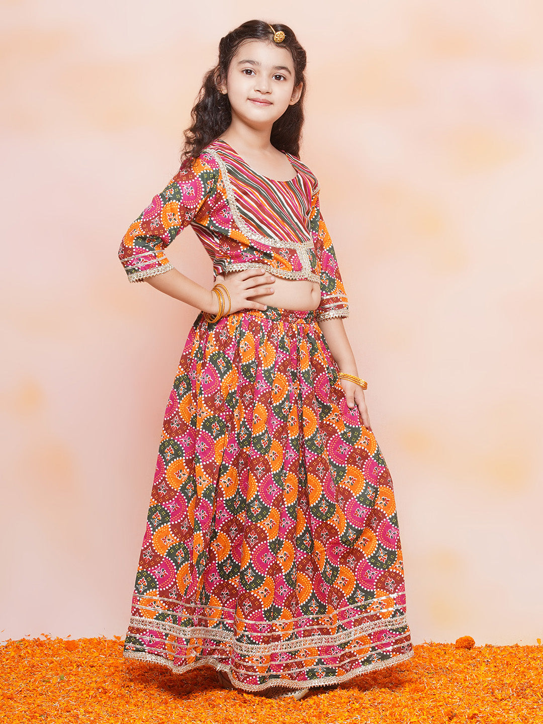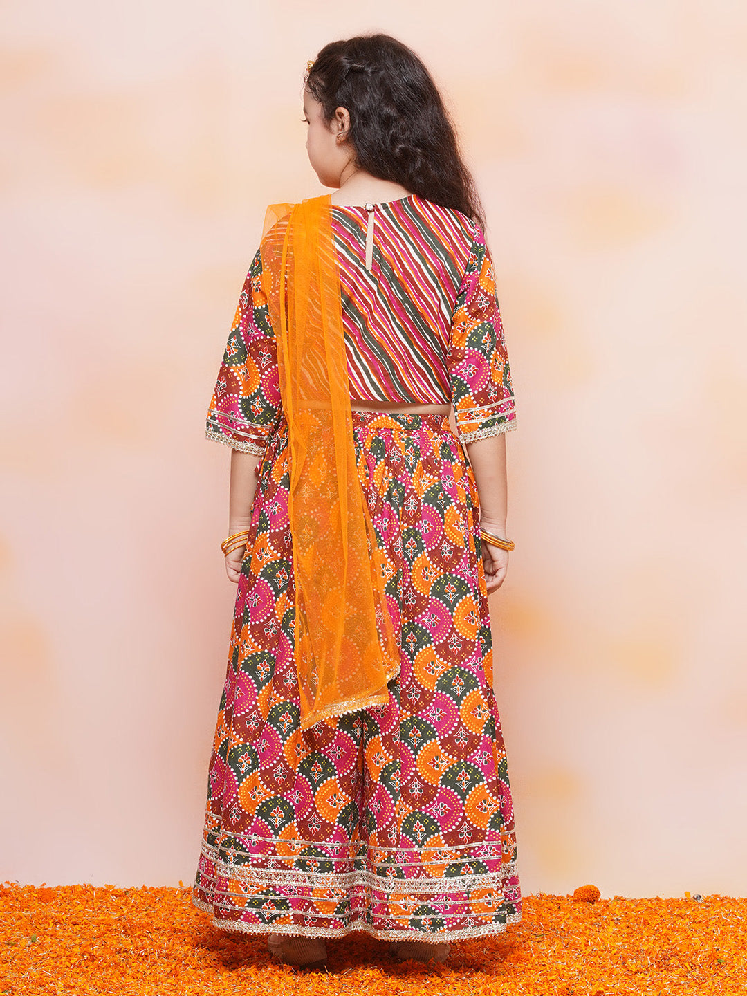 Kids Girls Orange Printed Cotton Lehenga Choli