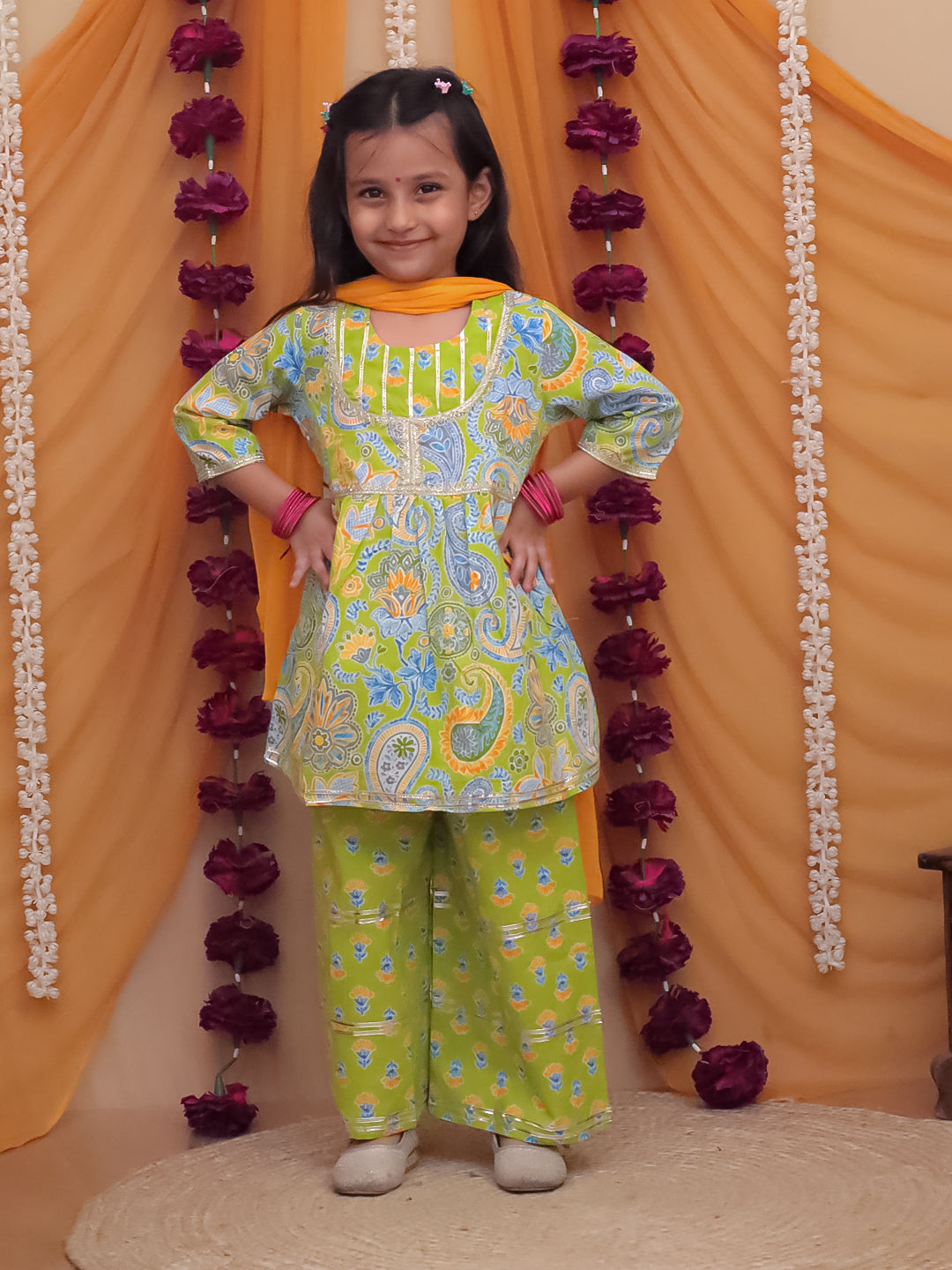 A stylish green cotton sharara set featuring a Three-Fourth Sleeves floral printed kurta with delicate sequins lace work. Paired with flowy sharara bottoms and a dupatta, it’s perfect for festive occasions.