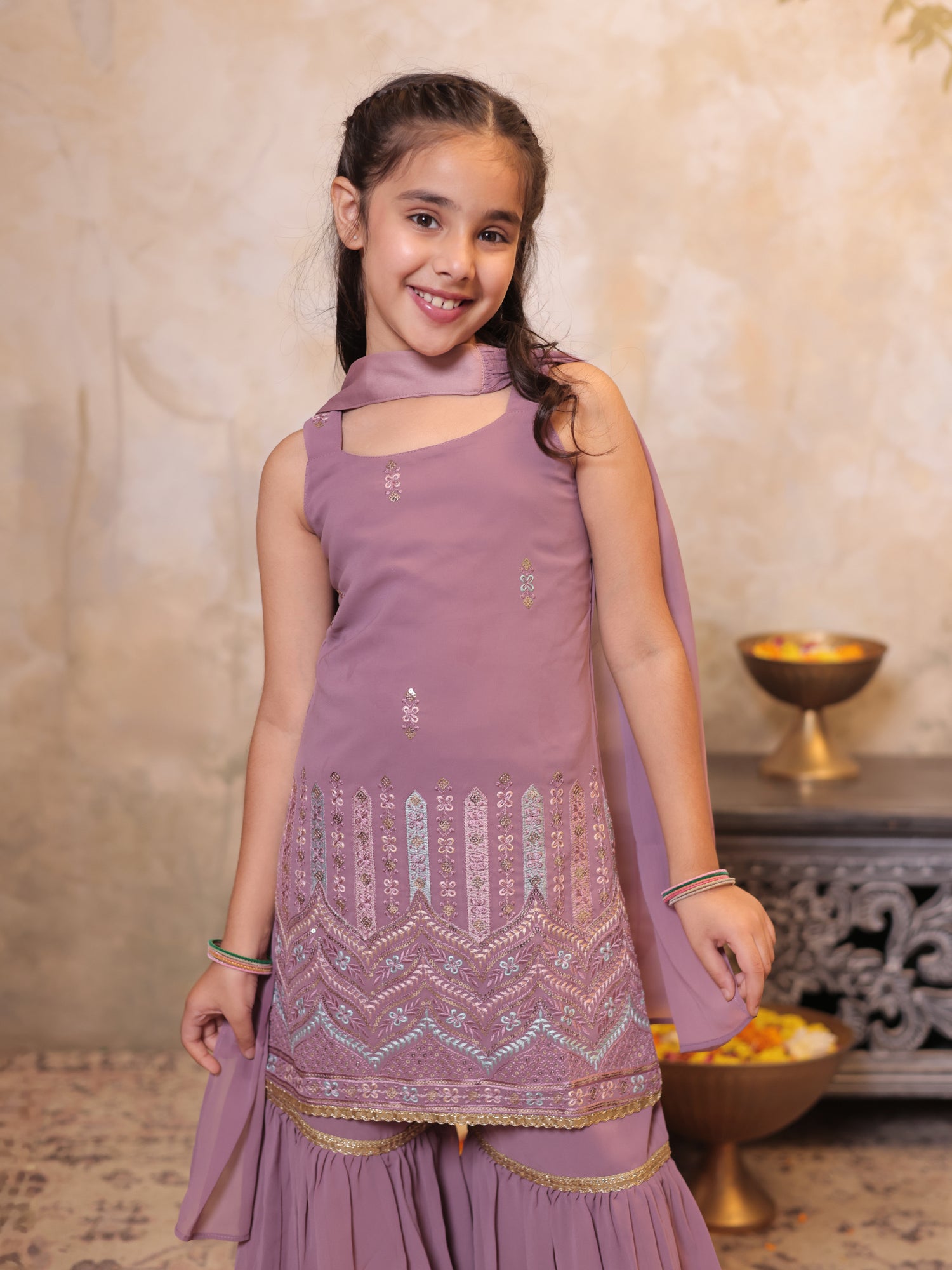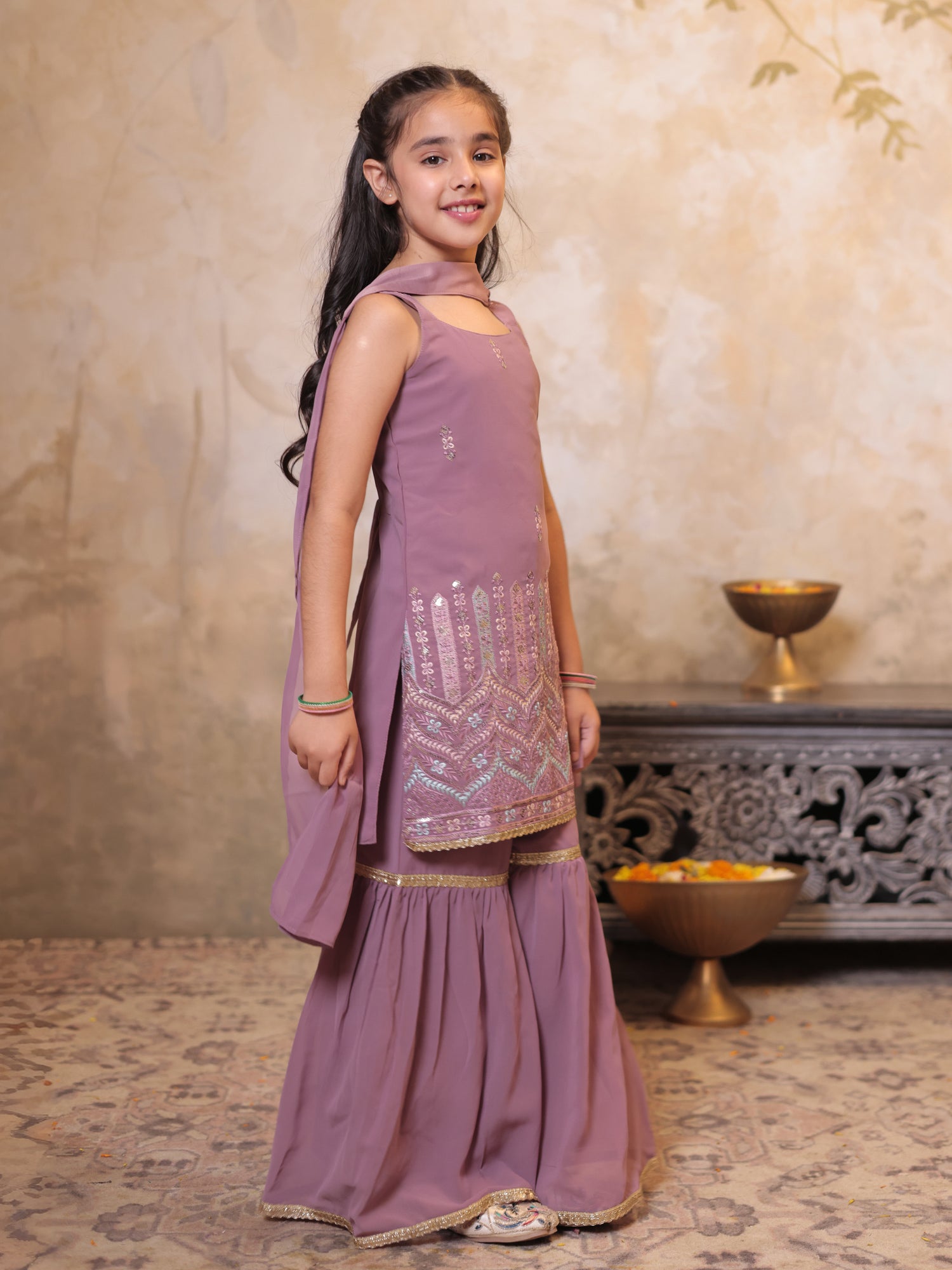 Girls Pink Georgette Sleeveless Heavy Embroidered Girls Sharara Set