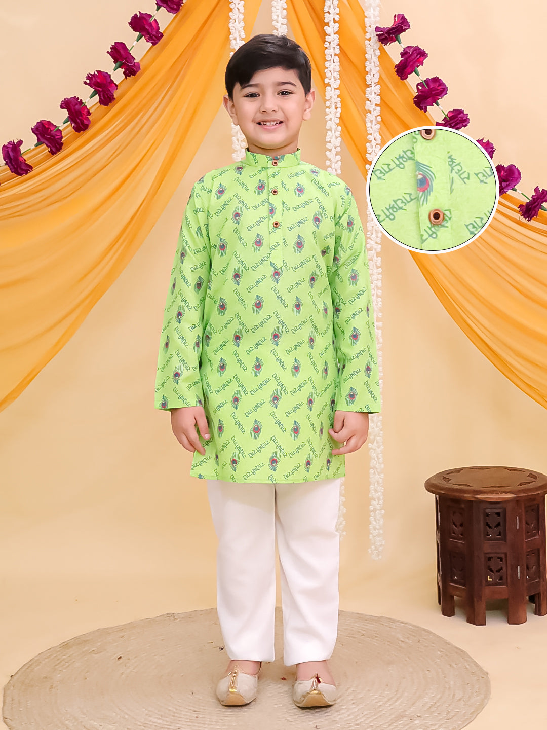 Green Cotton Full sleeves Krishna Printed Kurta Pyjama Set