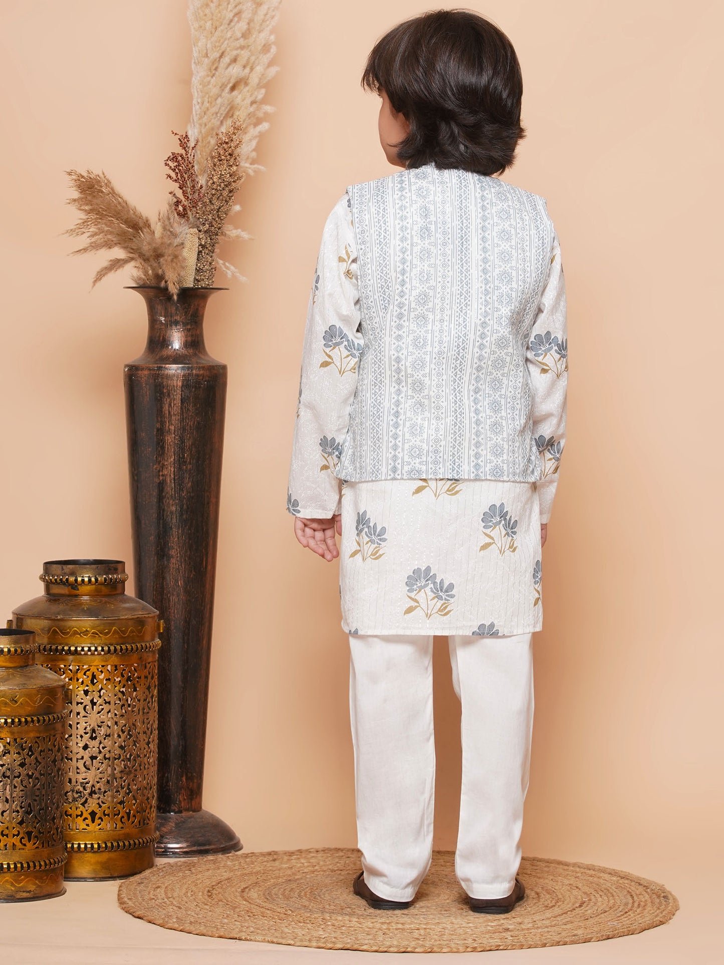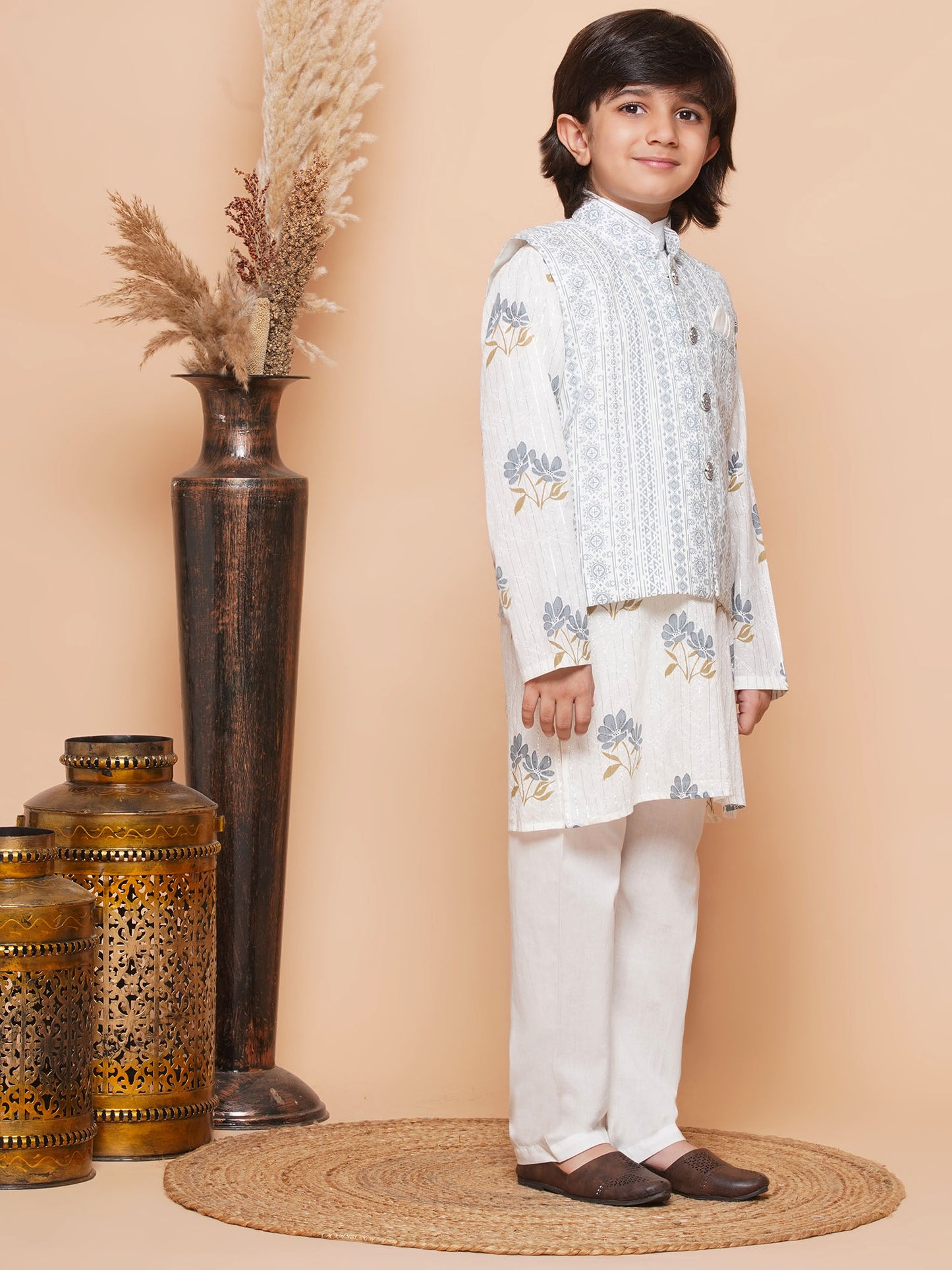A finely crafted 3 pc ethnic ensemble is a perfect combination of modern subtlety and traditional charm. Wear this kurta set for a classic ethnic dress-up and pair it up with the cotton floral printed jacket to notch up the look. This intricately designed attire is a great fit for your kid in this harsh summery festive season.