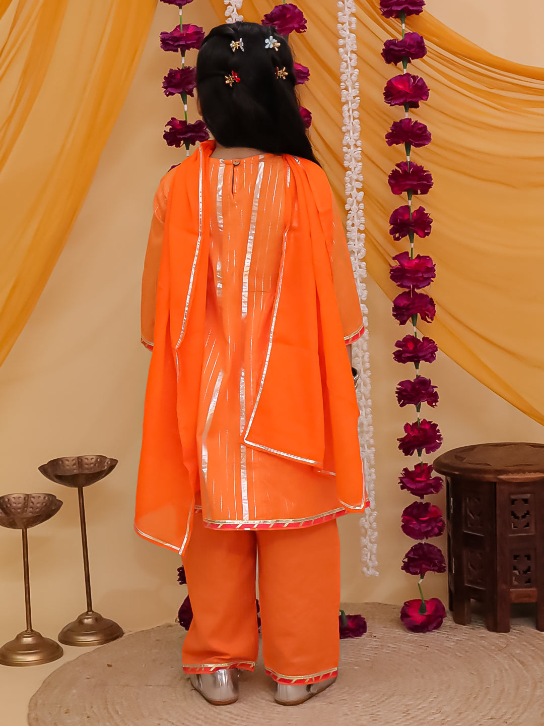 Elegant Orange cotton sleeveless suit with lurex shimmer and gotta work embroidery. Soft, breathable fabric keeps your child comfortable for festivals, weddings, and special occasions.
